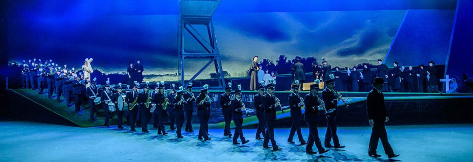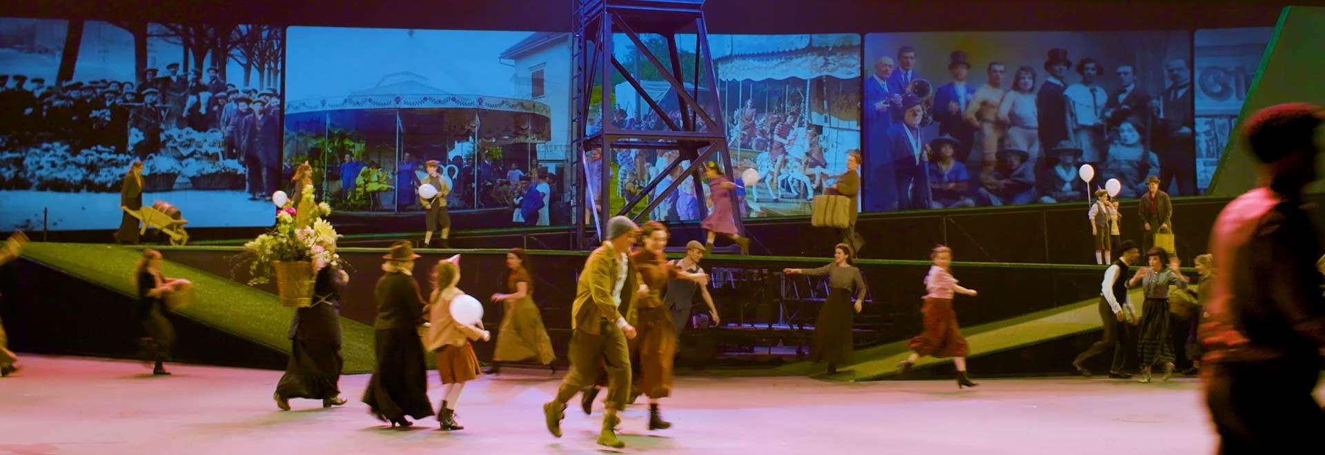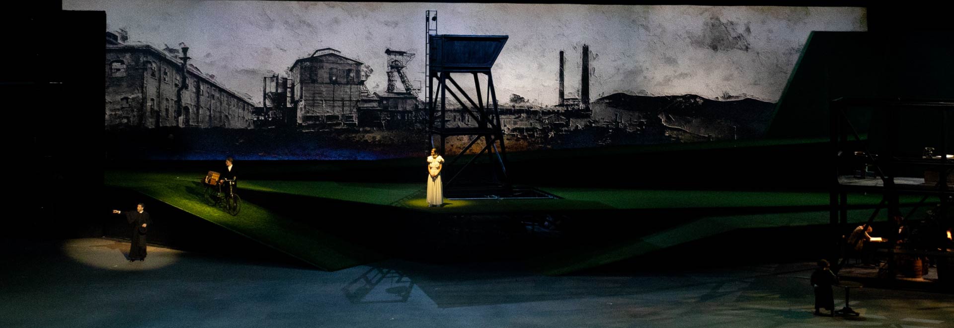 In de voorstelling Dagboek van een Herdershond zien we een zorgvuldig vormgegeven projectie die het historische en industriële Limburg van de vroege 20e eeuw oproept. Het achtergrondbeeld toont een grauwe, verweerde fabriek met schoorstenen die hoog boven het landschap uitsteken, een directe verwijzing naar de mijnbouwgeschiedenis van Limburg. Deze industriële setting benadrukt de harde realiteit waarin de personages leven en verbindt het verhaal van de herdershond met de gemeenschappen rond de mijnen.