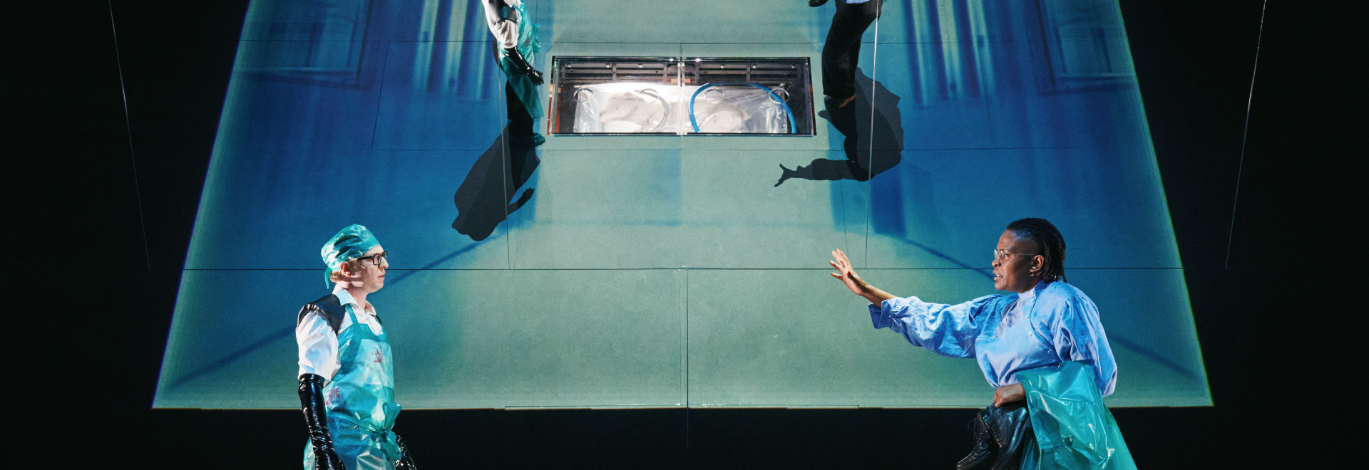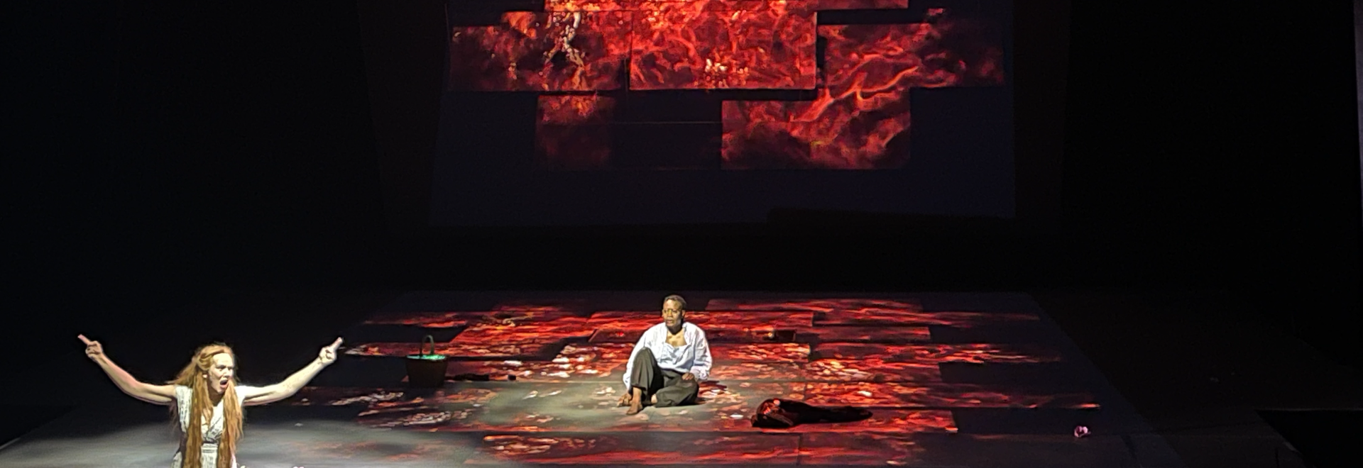 “Het toneelbeeld, ontworpen door Bernhard Hammer, bestond uit een groot hellend vlak met een uitsnede in het midden, waar gedurende de voorstelling iets leek te broeien. Boven het podium hing een grote spiegelwand schuin richting de zaal, waardoor het publiek zowel recht tegen de scène als van bovenaf op de spelers kon kijken. Dit ontwerp zorgde voor een voortdurend wisselend perspectief en benadrukte de verschillende lagen in het verhaal.”