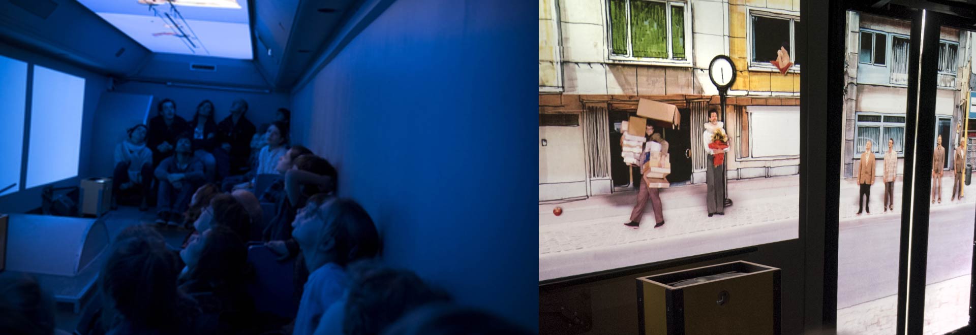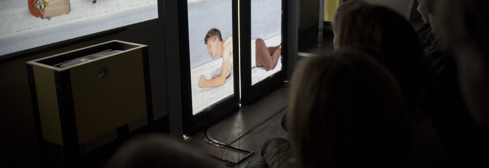 In De Vervelende Bus, een interactieve voorstelling van het Paleis, speelt projectie een unieke rol om het publiek onder te dompelen in een fantasierijke en soms absurde wereld. De voorstelling vindt plaats in een omgebouwde bus, waarbij toeschouwers dicht op elkaar zitten en worden omringd door projecties op de wanden en ramen. De ervaring trekt het publiek mee in een surrealistische reis, alsof de bus hen door een ander universum vervoert.